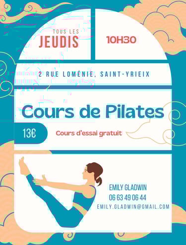 Je m'appelle Emily, j'ai 39 ans, j'enseigne le Pilates depuis 3 ans et le pratique depuis plus de 15 ans.